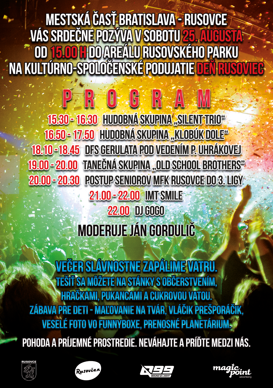 Už túto sobotu (25.8.) sa vidíme na lúke pod kaštieľom, počas najväčšej kultúrnej akcie roka v Rusovciach – Dňa Rusoviec. Tešiť sa môžete na bohatý kultúrny program, deti aj dospelí sa môžu po Rusovciach previesť vláčikom Prešporáčikom, pre malých bude pripravené mobilné planetárium, maľovanie na tvár a ďalšie trakcie.